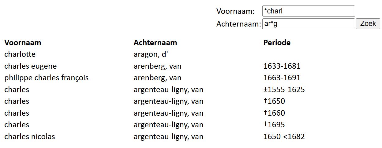 Stel dat u zoekt op voornaam = "*p" (zonder de aanhalingstekens) dan krijgt u alle personen met een P in de voornaam.